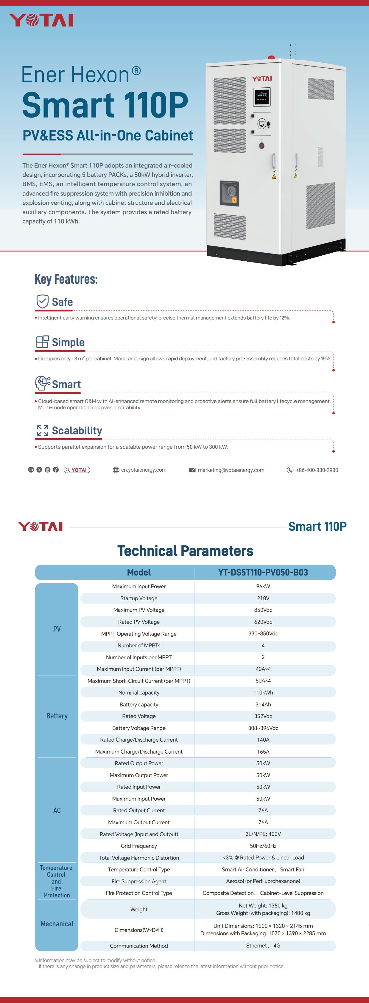The Ener Hexon® Smart 110P adopts an integrated air-cooled design, incorporating 5 battery PACKs, a 50kW hybrid inverter, BMS, EMS, an intelligent temperature control system, an advanced fire suppression system with precision inhibition and explosion venting, along with cabinet structure and electrical auxiliary components.